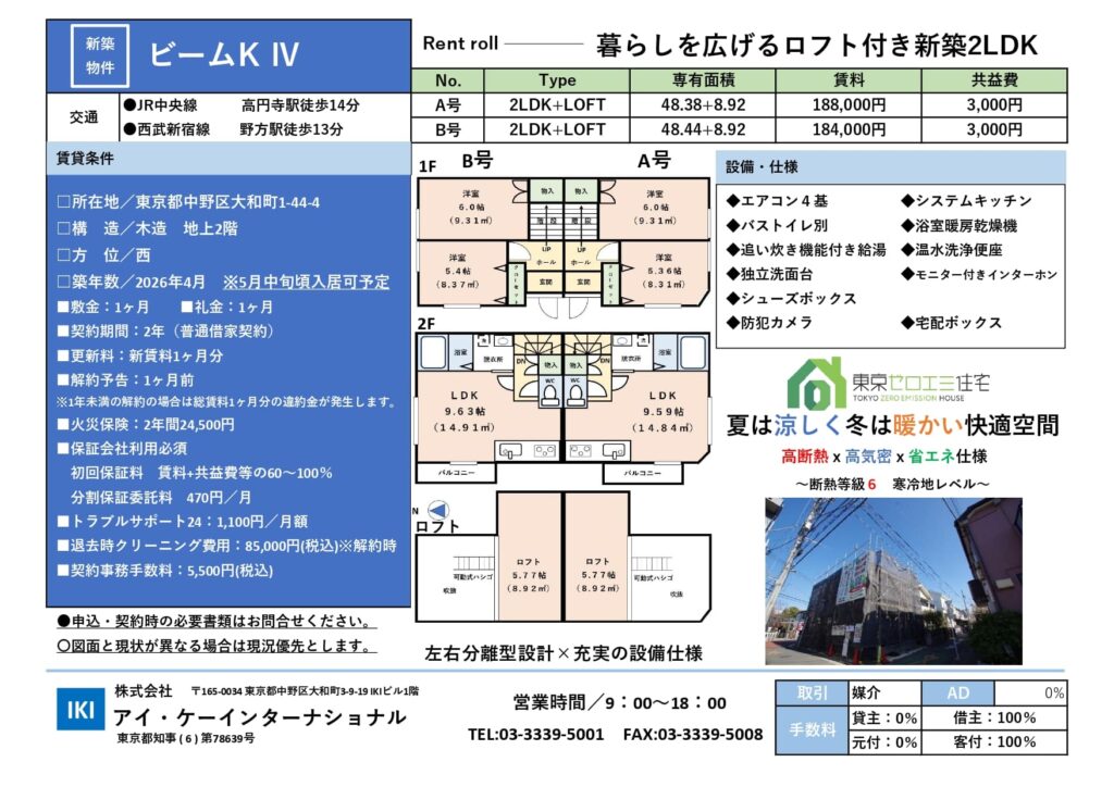 | 賃料・共益費 | A号 (賃料 188,000円 ・共益費 3,000円) B号 (賃料 184,000円 ・ 共益費 3,000円) |