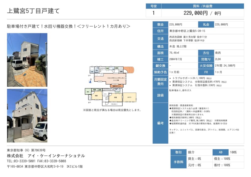 | 賃料・共益費 | 賃料 229,000円 ・ 共益費 0円 |